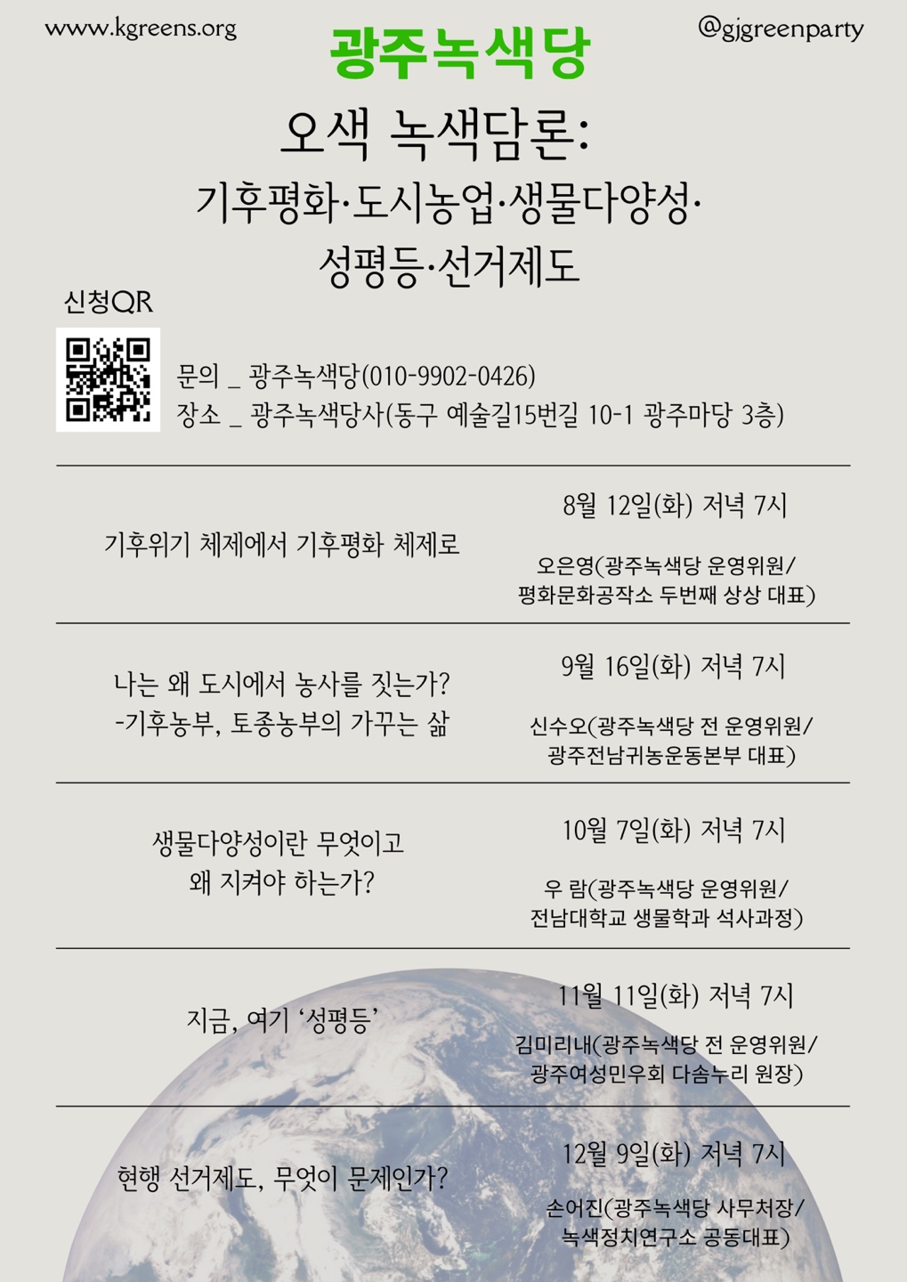 오는 8월부터 연말까지 매달, 광주녹색당에서 '평화, 농업, 생물다양성, 성평등, 선거제도'를 키워드로 연속 강연을 진행합니다.