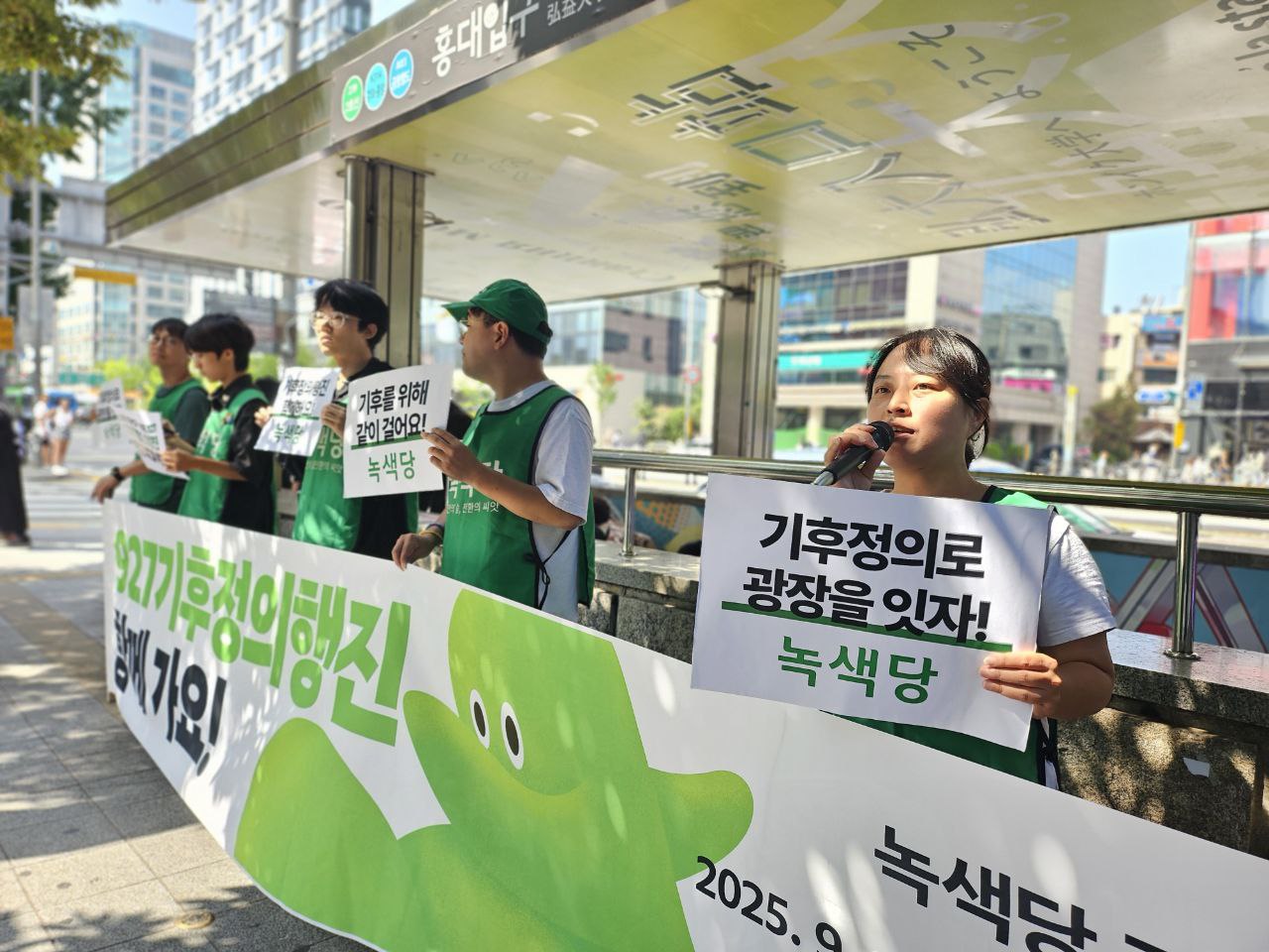 927 기후정의행진 같이 가요! 녹색당 정당연설회가 오늘 서울 홍대입구역 부근에서 있었습니다. 녹색당 이상현, 김찬휘 공동대표, 윤수영 부대표, 청년녹색당 문성웅 공동운영위원장 등이 참석했습니다.