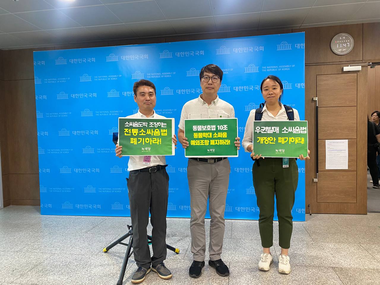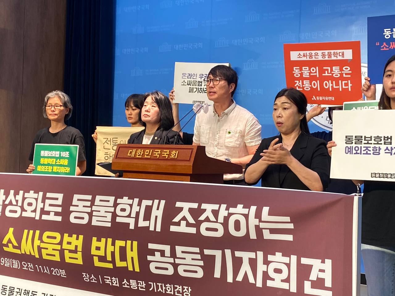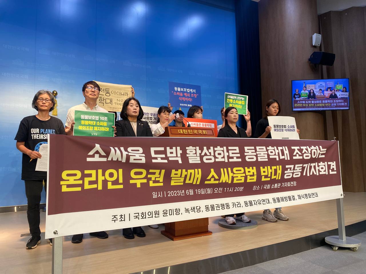 오늘 오전 11시 20분, 국회 소통관에서 녹색당과 윤미향 의원실, 동물권행동 카라, 동물자유연대, 동물해방물결, 채식평화연대가 소싸움 폐지를 위한 온라인 우권 발매 반대 기자회견을 열었습니다.